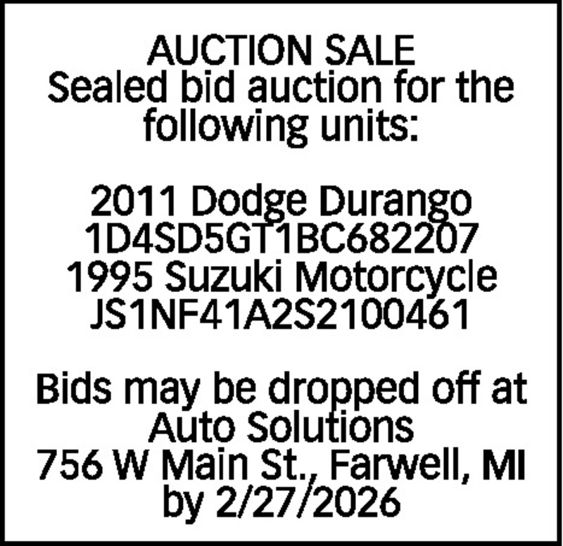 AUCTION SALE Sealed bid auction for the following units: 2011 Dodge Durango 1D4SD5GT1BC682207 1995 Suzuki Motorcycle JS1NF41A2S2100461 Bids may be dropped off at Auto Solutions 756 W Main St., Farwell, MI by 2/27/2026