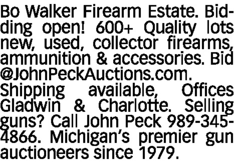 Bo Walker Firearm Estate. Bidding open! 600+ Quality lots new, used, collector firearms, ammunition & accessories. Bid @JohnPeckAuctions.com. Shipping available, Offices Gladwin & Charlotte. Selling guns? Call John Peck 989-345-4866. Michigan’s premier gun auctioneers since 1979.