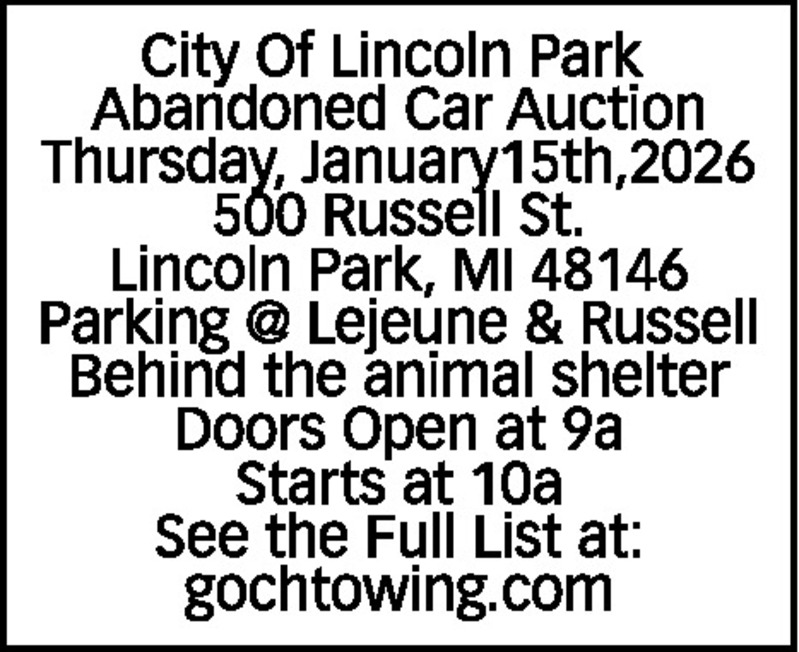 City Of Lincoln Park Abandoned Car Auction Thursday, January15th,2026 500 Russell St. Lincoln Park, MI 48146 Parking @ Lejeune & Russell Behind the animal shelter Doors Open at 9a Starts at 10a See the Full List at: gochtowing.com