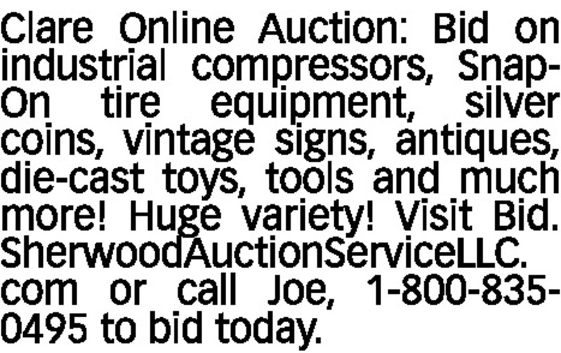 Clare Online Auction: Bid on industrial compressors, Snap-On tire equipment, silver coins, vintage signs, antiques, die-cast toys, tools and much more! Huge variety! Visit Bid.SherwoodAuctionServiceLLC.com or call Joe, 1-800-835-0495 to bid today.