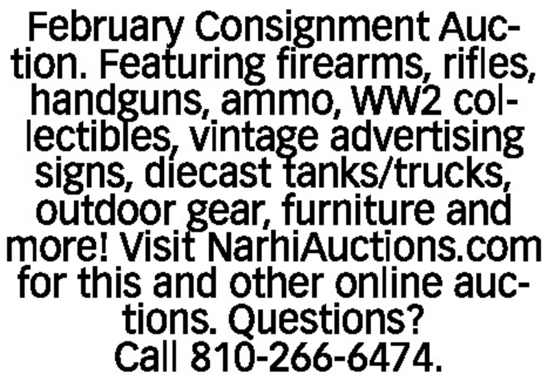 February Consignment Auction. Featuring firearms, rifles, handguns, ammo, WW2 collectibles, vintage advertising signs, diecast tanks/trucks, outdoor gear, furniture and more! Visit NarhiAuctions.com