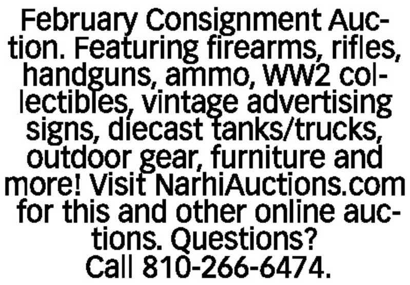 February Consignment Auction. Featuring firearms, rifles, handguns, ammo, WW2 collectibles, vintage advertising signs, diecast tanks/trucks, outdoor gear, furniture and more! Visit NarhiAuctions.com