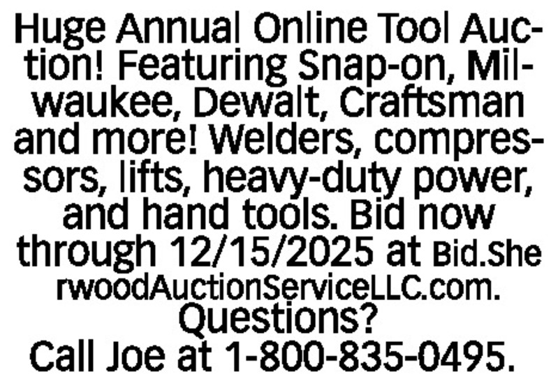 Huge Annual Online Tool Auction! Featuring Snap-on, Milwaukee, Dewalt, Craftsman and more! Welders, compressors, lifts, heavy-duty power, and hand tools. Bid now through 12/15/2025 at