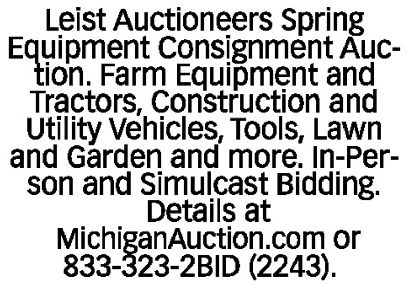 Leist Auctioneers Spring Equipment Consignment Auction. Farm Equipment and Tractors, Construction and Utility Vehicles, Tools, Lawn and Garden and more. In-Person and Simulcast Bidding. Details at MichiganAuction.com or 833-323-2BID (2243).