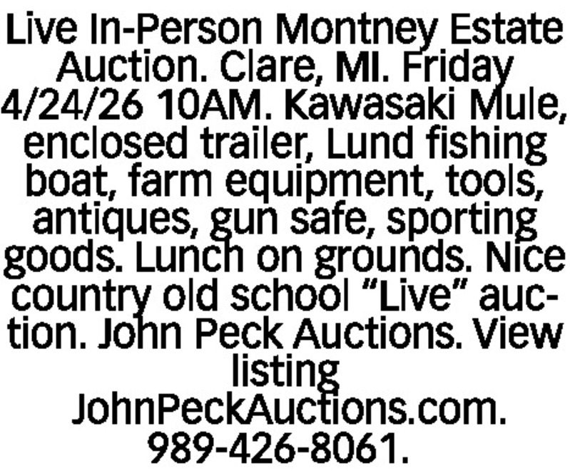 Live In-Person Montney Estate Auction. Clare, MI. Friday 4/24/26 10AM. Kawasaki Mule, enclosed trailer, Lund fishing boat, farm equipment, tools, antiques, gun safe, sporting goods. Lunch on grounds. Nice country old school “Live” auction. John Peck Auctions. View listing JohnPeckAuctions.com. 989-426-8061.