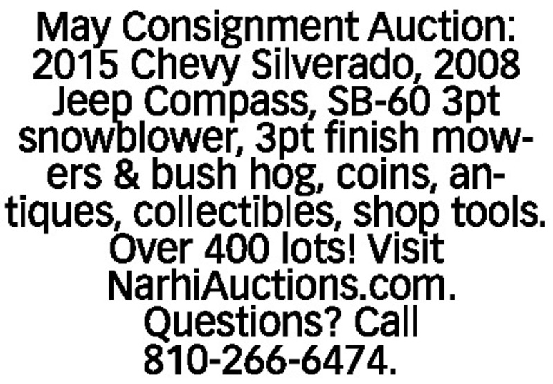 May Consignment Auction: 2015 Chevy Silverado, 2008 Jeep Compass, SB-60 3pt snowblower, 3pt finish mowers & bush hog, coins, antiques, collectibles, shop tools. Over 400 lots! Visit NarhiAuctions.com. Questions? Call 810-266-6474.