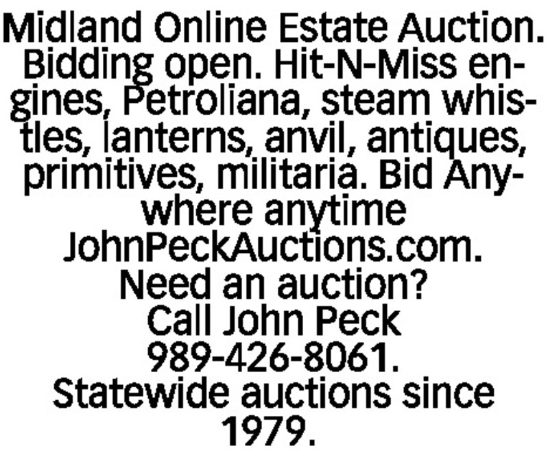 Midland Online Estate Auction. Bidding open. Hit-N-Miss engines, Petroliana, steam whistles, lanterns, anvil, antiques, primitives, militaria. Bid Anywhere anytime