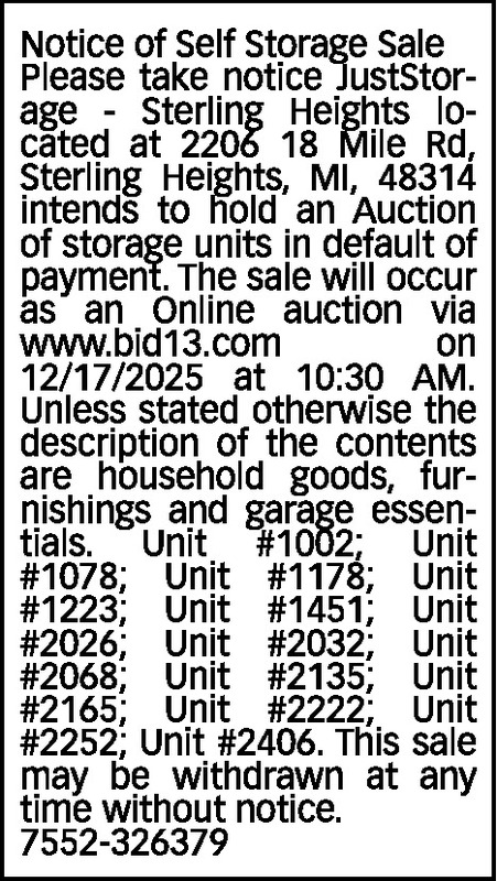 Notice of Self Storage Sale Please take notice JustStorage - Sterling Heights located at 2206 18 Mile Rd, Sterling Heights, MI, 48314 intends to hold an Auction of storage units in default of payment. The sale will occur as an Online auction via www.bid13.com on 12/17/2025 at 10:30 AM. Unless stated otherwise the description of the contents are household goods, furnishings and garage essentials. Unit #1002; Unit #1078; Unit #1178; Unit #1223; Unit #1451; Unit #2026; Unit #2032; Unit #2068; Unit #2135; Unit #2165; Unit #2222; Unit #2252; Unit #2406. This sale may be withdrawn at any time without notice. 7552-326379