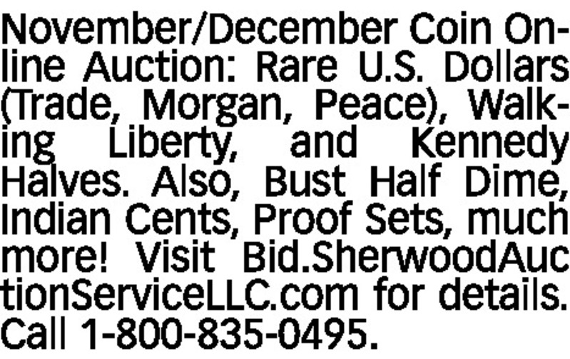 November/December Coin Online Auction: Rare U.S. Dollars (Trade, Morgan, Peace), Walking Liberty, and Kennedy Halves. Also, Bust Half Dime, Indian Cents, Proof Sets, much more! Visit Bid.SherwoodAuctionServiceLLC.com for details. Call 1-800-835-0495.