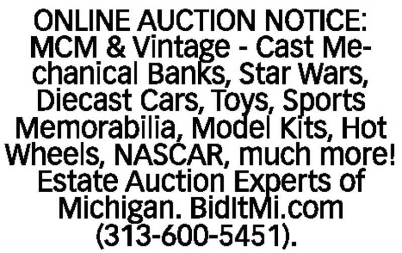 ONLINE AUCTION NOTICE: MCM & Vintage - Cast Mechanical Banks, Star Wars, Diecast Cars, Toys, Sports Memorabilia, Model Kits, Hot Wheels, NASCAR, much more! Estate Auction Experts of Michigan. BidItMi.com (313-600-5451).