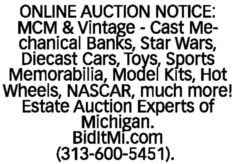ONLINE AUCTION NOTICE: MCM & Vintage - Cast Mechanical Banks, Star Wars, Diecast Cars, Toys, Sports Memorabilia, Model Kits, Hot Wheels, NASCAR, much more! Estate Auction Experts of Michigan. BidItMi.com (313-600-5451).