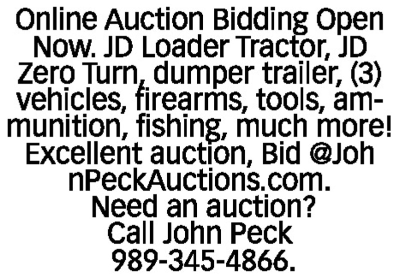 Online Auction Bidding Open Now. JD Loader Tractor, JD Zero Turn, dumper trailer, (3) vehicles, firearms, tools, ammunition, fishing, much more! Excellent auction, Bid @JohnPeckAuctions.com. Need an auction? Call John Peck 989-345-4866.