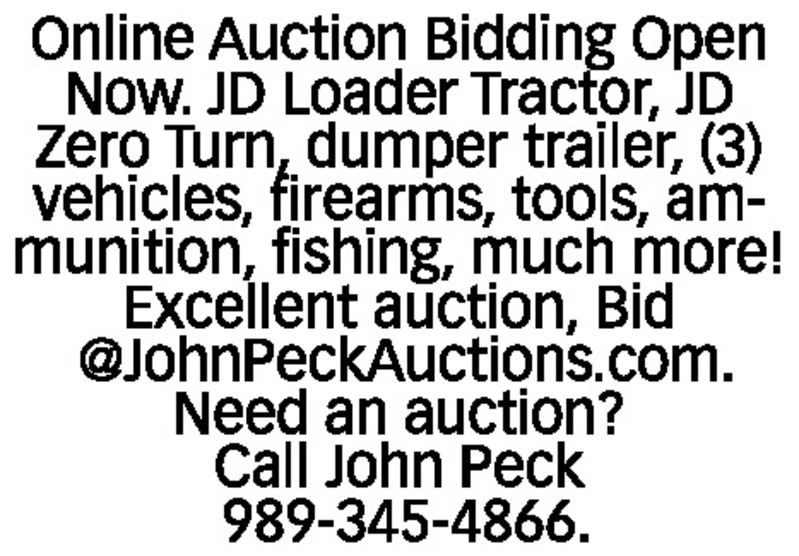 Online Auction Bidding Open Now. JD Loader Tractor, JD Zero Turn, dumper trailer, (3) vehicles, firearms, tools, ammunition, fishing, much more! Excellent auction, Bid @JohnPeckAuctions.com. Need an auction? Call John Peck 989-345-4866.