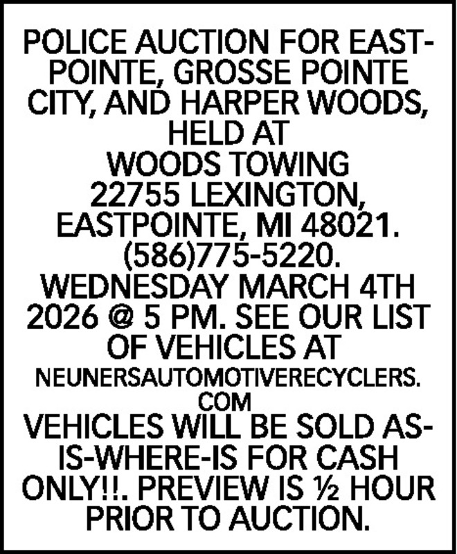 POLICE AUCTION FOR EASTPOINTE, GROSSE POINTE CITY, AND HARPER WOODS, HELD AT