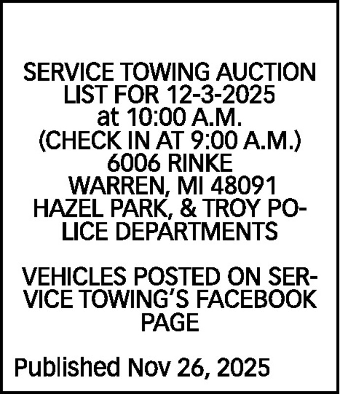 SERVICE TOWING AUCTION LIST FOR 12-3-2025 a t 10:00 A.M. (CHECK IN AT 9:00 A.M.) 6006 RINKE WARREN, MI 48091 HAZEL PARK, & TROY POLICE DEPARTMENTS VEHICLES POSTED ON SERVICE TOWING’S FACEBOOK PAGE Published Nov 26, 2025