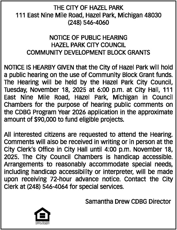 THE CITY OF HAZEL PARK 111 East Nine Mile Road, Hazel Park, Michigan 48030 (248) 546-4060 NOTICE OF PUBLIC HEARING HAZEL PARK CITY COUNCIL COMMUNITY DEVELOPMENT BLOCK GRANTS NOTICE IS HEARBY GIVEN that the City of Hazel Park will hold a public hearing on the use of Community Block Grant funds. The Hearing will be held by the Hazel Park City Council, Tuesday, November 18, 2025 at 6:00 p.m. at City Hall, 111 East Nine Mile Road, Hazel Park, Michigan in Council Chambers for the purpose of hearing public comments on the CDBG Program Year 2026 application in the approximate amount of $90,000 to fund eligible projects. All interested citizens are requested to attend the Hearing. Comments will also be received in writing or in person at the City Clerk’s Office in City Hall until 4:00 p.m. November 18, 2025. The City Council Chambers is handicap accessible. Arrangements to reasonably accommodate special needs, including handicap accessibility or interpreter, will be made upon receiving 72-hour advance notice. Contact the City Clerk at (248) 546-4064 for special services. Samantha Drew CDBG Director