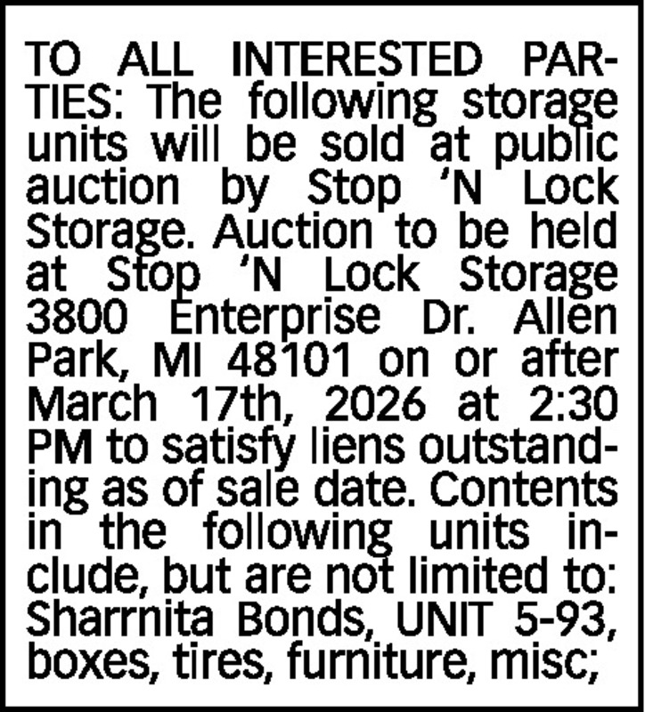 TO ALL INTERESTED PARTIES: The following storage units will be sold at public auction by Stop ‘N Lock Storage. Auction to be held at Stop ‘N Lock Storage 3800 Enterprise Dr. Allen Park, MI 48101 on or after March 17th, 2026 at 2:30 PM to satisfy liens outstanding as of sale date. Contents in the following units include, but are not limited to: Sharrnita Bonds, UNIT 5-93, boxes, tires, furniture, misc;