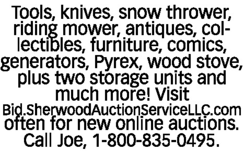 Tools, knives, snow thrower, riding mower, antiques, collectibles, furniture, comics, generators, Pyrex, wood stove, plus two storage units and much more! Visit