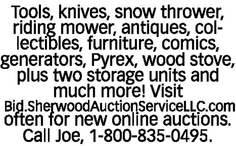 Tools, knives, snow thrower, riding mower, antiques, collectibles, furniture, comics, generators, Pyrex, wood stove, plus two storage units and much more! Visit