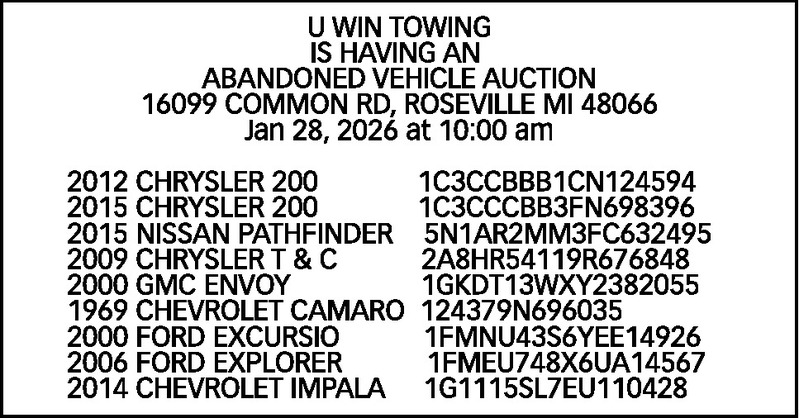 U WIN TOWING IS HAVING AN ABANDONED VEHICLE AUCTION 16099 COMMON RD, ROSEVILLE MI 48066 Jan 28, 2026 at 10:00 am 2012 CHRYSLER 200 1C3CCBBB1CN124594 2015 CHRYSLER 200 1C3CCCBB3FN698396 2015 NISSAN PATHFINDER 5N1AR2MM3FC632495 2009 CHRYSLER T & C 2A8HR54119R676848 2000 GMC ENVOY 1GKDT13WXY2382055 1969 CHEVROLET CAMARO 124379N696035 2000 FORD EXCURSIO 1FMNU43S6YEE14926 2006 FORD EXPLORER 1FMEU748X6UA14567 2014 CHEVROLET IMPALA 1G1115SL7EU110428