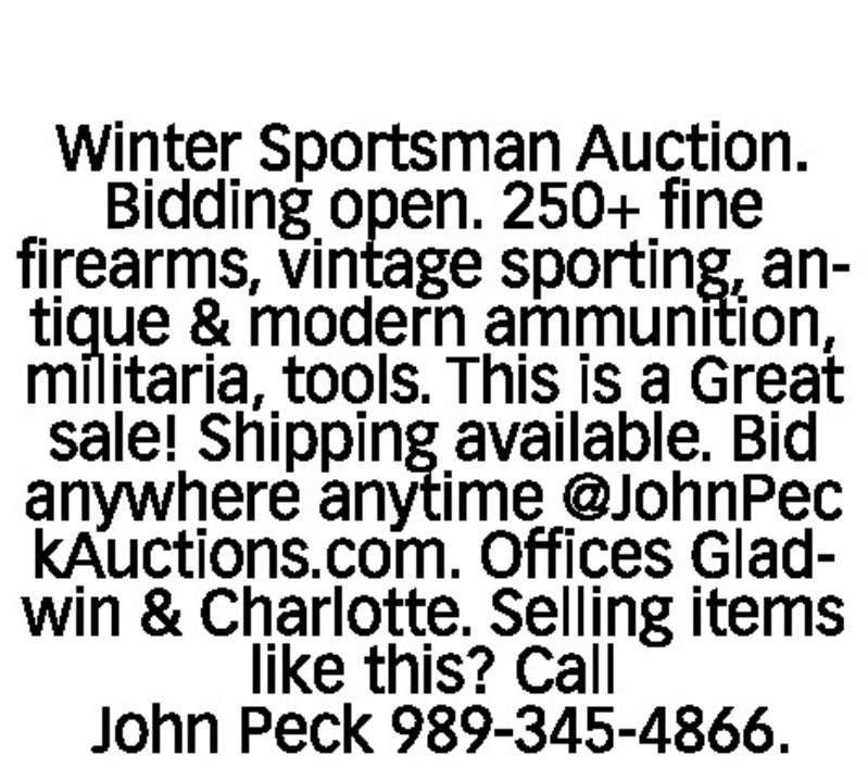 Winter Sportsman Auction. Bidding open. 250+ fine firearms, vintage sporting, antique & modern ammunition, militaria, tools. This is a Great sale! Shipping available. Bid anywhere anytime @JohnPeckAuctions.com. Offices Gladwin & Charlotte. Selling items like this? Call