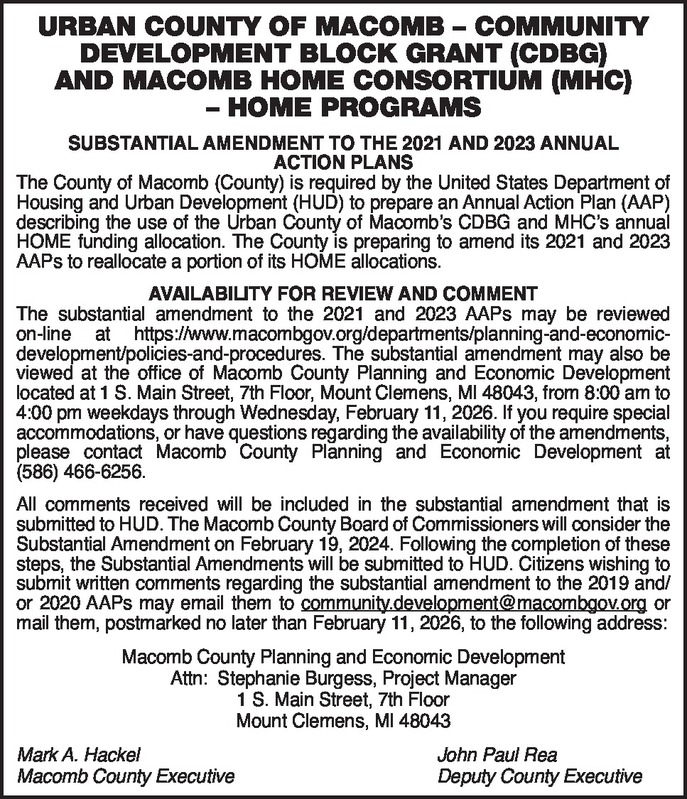 URBAN COUNTY OF MACOMB – COMMUNITY DEVELOPMENT BLOCK GRANT (CDBG) AND MACOMB HOME CONSORTIUM (MHC) – HOME PROGRAMS SUBSTANTIAL AMENDMENT TO THE 2021 AND 2023 ANNUAL ACTION PLANS The County of Macomb (County) is required by the United States Department of Housing and Urban Development (HUD) to prepare an Annual Action Plan (AAP) describing the use of the Urban County of Macomb’s CDBG and MHC’s annual HOME funding allocation. The County is preparing to amend its 2021 and 2023 AAPs to reallocate a portion of its HOME allocations. AVAILABILITY FOR REVIEW AND COMMENT The substantial amendment to the 2021 and 2023 AAPs may be reviewed on-line at https://www.macombgov.org/departments/planning-and-economic-development/policies-and-procedures. The substantial amendment may also be viewed at the office of Macomb County Planning and Economic Development located at 1 S. Main Street, 7th Floor, Mount Clemens, MI 48043, from 8:00 am to 4:00 pm weekdays through Wednesday, February 11, 2026. If you require special accommodations, or have questions regarding the availability of the amendments, please contact Macomb County Planning and Economic Development at (586) 466-6256. All comments received will be included in the substantial amendment that is submitted to HUD. The Macomb County Board of Commissioners will consider the Substantial Amendment on February 19, 2024. Following the completion of these steps, the Substantial Amendments will be submitted to HUD. Citizens wishing to submit written comments regarding the substantial amendment to the 2019 and/or 2020 AAPs may email them to community.development@macombgov.org or mail them, postmarked no later than February 11, 2026, to the following address: Macomb County Planning and Economic Development Attn: Stephanie Burgess, Project Manager 1 S. Main Street, 7th Floor Mount Clemens, MI 48043 Mark A. Hackel John Paul Rea Macomb County Executive Deputy County Executive