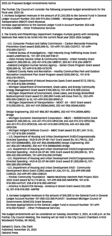 2025-26 Proposed Budget Amendments Notice The Pontiac City Council will consider the following proposed budget amendments for the fiscal year 2025-26: 1. Increase budgeted revenues in the amount of $1,250,000 to the General Fund in General Ledger Account Number 202-448-974.056-CARBRE – Michigan Department of Transportation (MDOT) Grant Revenue Increase appropriations to the General Ledger Fund in Account Number 203-448- 974.056-CARBRE – Other Professional Services 2. The Grants and Philanthropy Department manages multiple grants with remaining balances that need to be rolled into the current fiscal year 2025-2026 budget: ~U.S. Consumer Product and Safety Commission – Carbon Monoxide Poisoning Prevention Grant award $300,000-GL: 101-699-731.005-CODTCT; 101-699- 818.000-CODTCT ~ Federal Bureau of Investigations - High Intensity Drug Trafficking Areas Grant award undefined-GL: 101-301-818.069-FBI-OT ~ USDA Foresty Service Urban & Community Forestry - Urban Forestry Grant award $1,000,000-GL: 202-451-818.236-URBFST; 203-451-818.236-URBFST ~Oakland Livingston Human Service Agency – Senior Chore Program Grant award $200,000-GL: 101-699-818.000-OCSCPR ~Oakland County Parks and Recreation – Healthy Communities Park and Outdoor Recreation Investment Plan Grant Program award $500,000-GL: 101-818- 818.018-CRYSTL ~Michigan Department of Natural Resources Spark Grant award $772,700-GL: 101-818-818.000-SPARKG ~ Michigan Department of Environment, Great Lakes, and Energy Community Energy Management Grant award $100,000-GL:101-699-818.000-25EGLE ~ Michigan Department of Environment, Great Lakes, and Energy Brownfield Redevelopment Grant award $1,000,000 Funds will move from GL: 252-699- 890.000-CDBG25 to GL:101-699-818.000-BRNFLD ~ Michigan Department of Transportation – MDOT -24 – 5047 Grant award $10,000,000-GL: 202-447-559.000MLKBRG; 202-447-806.006MLKBRG- Design Engineering; 202-447-806.007-MLKBRG; 202-447-974.000MLKBRG- Bridge ~ Michigan Economic Development Corporation – MEDC – M0000146355 Grant award $7,500,000-GL: 445-451-974.074-OPDCON; 445-463-974.072-OPDCON; 445-451-974.072-OPDCON; 445-451-818.000-OPDCON; 445-451-806.000- OPDCON ~ Michigan Indigent Defense Council – MIDC Grant award $1,301,249.13-GL: 277-137-818.000-24MIDC ~ U.S. Department of Housing and Urban Development (HUD)/Congressionally Directed Spending - HUD-B-24-CP-MI-1167 Grant award $4,161,790-GL: 202- 447-559.000MLKBRG; 202-447-806.006MLKBRG-Design Engineering; 202- 447-806.007-MLKBRG; 202-447-974.000MLKBRG-Bridge ~U.S. Department of Housing and Urban Development (HUD)/Congressionally Directed Spending - HUD-B-24-CP-MI-1205 Grant award $2,000,000-GL: 101- 000-532.000-DPPARG; 101-699-818.000-DPPARG ~U.S. Department of Housing and Urban Development (HUD)/Congressionally Directed Spending - HUD-B-22-CP-MI-0481 Grant award $1,000,000-GL:101- 000-288.000-DPPARG ~U.S. Department of Housing and Urban Development (HUD - Community Development Block Grant (CDBG) award $1,436,727-GL: 252-699-890.000- CDBG25; 252-699-897.000-CDBG25 ~ Pontiac Community Foundation - Mattie Mckinney Hatchett Park Project 2024- 2025 Grant award $214,773.80-GL; 101-699-808.000-MMHPRK; 101-818- 818.000-HATCHT; 258-818-818.000-ARPHAT ~ America in Bloom/CN Railway - America in Bloom Grant award $25,000- GL:101-818-818.000 -AIRPRK 3. Increase budgeted revenues in the amount of $40,000 to the General Fund in General Ledger Account Number 101-000-532.000-PLNAST– Southeast Michigan Council of Governments (SEMCOG) Grant Revenue Increase appropriations to the General Ledger Fund in Account Number 101-699- 818.000-PLNAST – Other Professional Services The budget amendments will be considered on Tuesday, December 2, 2025, at 6:00 p.m. at the Pontiac City Council Meeting. The meeting will be held in the City Council Chambers 47450 Woodward Pontiac, MI 48342. Garland S. Doyle, City Clerk Published: November 25, 2025 Oakland Press