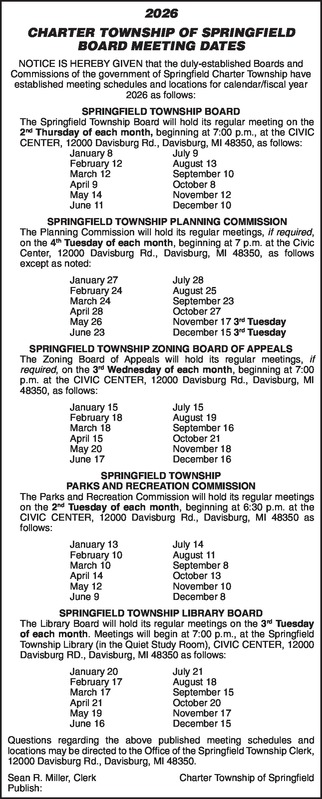 2026 CHARTER TOWNSHIP OF SPRINGFIELD BOARD MEETING DATES NOTICE IS HEREBY GIVEN that the duly-established Boards and Commissions of the government of Springfield Charter Township have established meeting schedules and locations for calendar/fiscal year 2026 as follows: SPRINGFIELD TOWNSHIP BOARD The Springfield Township Board will hold its regular meeting on the 2nd Thursday of each month, beginning at 7:00 p.m., at the CIVIC CENTER, 12000 Davisburg Rd., Davisburg, MI 48350, as follows: January 8 July 9 February 12 August 13 March 12 September 10 April 9 October 8 May 14 November 12 June 11 December 10 SPRINGFIELD TOWNSHIP PLANNING COMMISSION The Planning Commission will hold its regular meetings, if required, on the 4th Tuesday of each month, beginning at 7 p.m. at the Civic Center, 12000 Davisburg Rd., Davisburg, MI 48350, as follows except as noted: January 27 July 28 February 24 August 25 March 24 September 22 April 28 October 27 May 26 November 17 3rd Tuesday June 23 December 15 3rd Tuesday SPRINGFIELD TOWNSHIP ZONING BOARD OF APPEALS The Zoning Board of Appeals will hold its regular meetings, if required, on the 3rd Wednesday of each month, beginning at 7:00 p.m. at the CIVIC CENTER, 12000 Davisburg Rd., Davisburg, MI 48350, as follows: January 15 July 15 February 18 August 19 March 18 September 16 April 15 October 21 May 20 November 18 June 17 December 16 SPRINGFIELD TOWNSHIP PARKS AND RECREATION COMMISSION The Parks and Recreation Commission will hold its regular meetings on the 2nd Tuesday of each month, beginning at 6:30 p.m. at the CIVIC CENTER, 12000 Davisburg Rd., Davisburg, MI 48350 as follows: January 13 July 14 February 10 August 11 March 10 September 8 April 14 October 13 May 12 November 10 June 9 December 8 SPRINGFIELD TOWNSHIP LIBRARY BOARD The Library Board will hold its regular meetings on the 3rd Tuesday of each month. Meetings will begin at 7:00 p.m., at the Springfield Township Library (in the Quiet Study Room), CIVIC CENTER, 12000 Davisburg RD., Davisburg, MI 48350 as follows: January 20 July 21 February 17 August 18 March 17 September 15 April 21 October 20 May 19 November 17 June 16 December 15 Questions regarding the above published meeting schedules and locations may be directed to the Office of the Springfield Township Clerk, 12000 Davisburg Rd., Davisburg, MI 48350. Sean R. Miller, Clerk Charter Township of Springfield Publish: