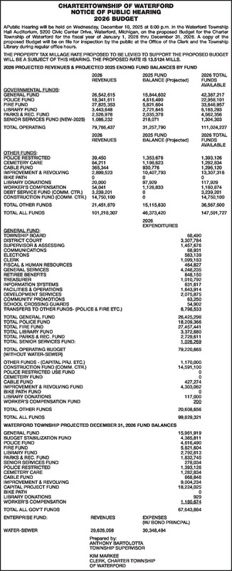 2026 PROJECTED REVENUES & PROJECTED 2025 ENDING FUND BALANCES BY FUND 2026 2025 FUND 2026 TOTAL REVENUES BALANCE (Projected) FUNDS AVAILABLE GOVERNMENTAL FUNDS: GENERAL FUND 26,542,615 15,844,602 42,387,217 POLICE FUND 18,341,611 4,616,490 22,958,101 FIRE FUND 27,825,353 5,821,604 33,646,957 LIBRARY FUND 3,443,648 2,721,645 6,165,293 PARKS & REC. FUND 2,526,978 2,035,378 4,562,356 SENIOR SERVICES FUND (NEW-2025) 1,086,232 218,071 1,304,303 TOTAL OPERATING 79,766,437 31,257,790 111,024,227 2026 2025 FUND 2026 TOTAL REVENUES BALANCE (Projected) FUNDS AVAILABLE OTHER FUNDS: POLICE RESTRICTED 39,450 1,353,676 1,393,126 CEMETERY CARE 84,211 1,198,623 1,282,834 CABLE FUND 365,344 930,776 1,296,120 IMPROVEMENT & REVOLVING 2,899,523 10,407,793 13,307,316 BIKE PATH 0 0 0 LIBRARY DONATIONS 20,000 97,929 117,929 WORKER'S COMPENSATION 54,041 1,126,833 1,180,874 DEBT SERVICE FUND (COMM. CTR.) 3,239,201 0 3,239,201 CONSTRUCTION FUND (COMM. CTR.) 14,750,100 0 14,750,100 TOTAL OTHER FUNDS 21,451,870 15,115,630 36,567,500 TOTAL ALL FUNDS 101,218,307 46,373,420 147,591,727 2026 EXPENDITURES GENERAL FUND: TOWNSHIP BOARD 68,490 DISTRICT COURT 3,307,784 SUPERVISOR & ASSESSING 1,457,676 COMMUNICATIONS 68,931 ELECTIONS 583,139 CLERK 1,099,183 FISCAL & HUMAN RESOURCES 464,827 GENERAL SERVICES 4,248,235 RETIREE BENEFITS 848,150 TREASURER 1,010,792 INFORMATION SYSTEMS 631,617 FACILITIES & OPERATIONS 1,643,914 DEVELOPMENT SERVICES 2,075,875 COMMUNITY PROMOTIONS 63,250 SCHOOL CROSSING GUARDS 54,902 TRANSFERS TO OTHER FUNDS- (POLICE & FIRE ETC.) 8,798,533 TOTAL GENERAL FUND 26,425,298 TOTAL POLICE FUND 18,209,366 TOTAL FIRE FUND 27,457,441 TOTAL LIBRARY FUND 3,372,680 TOTAL PARKS & REC. FUND 2,729,611 TOTAL SENIOR SERVICES FUND: 1,026,269 TOTAL OPERATING BUDGET 79,220,665 (WITHOUT WATER-SEWER) OTHER FUNDS - (CAPITAL PRJ. ETC.) 1,170,000 CONSTRUCTION FUND - (COMM. CTR.) 14,591,100 POLICE RESTRICTED USE FUND 0 CEMETERY FUND 0 CABLE FUND 427,274 IMPROVEMENT & REVOLVING FUND 4,303,082 BIKE PATH FUND 0 LIBRARY DONATIONS 117,000 WORKER'S COMPENSATION FUND 200 TOTAL OTHER FUNDS 20,608,656 TOTAL ALL FUNDS 99,829,321 WATERFORD TOWNSHIP - PROJECTED DECEMBER 31, 2026 FUND BALANCES GENERAL FUND 15,961,919 BUDGET STABILIZATION FUND 4,385,811 POLICE FUND 4,616,490 FIRE FUND 5,821,604 LIBRARY FUND 2,792,613 PARKS & REC. FUND 1,832,745 SENIOR SERVICES FUND 278,034 POLICE RESTRICTED 1,393,126 CEMETERY CARE 1,282,834 CABLE FUND 868,846 IMPROVEMENT & REVOLVING 9,004,234 CAPITAL PROJECT FUND 18,224,025 BIKE PATH 0 LIBRARY DONATIONS 929 WORKER'S COMPENSATION 1,180,674 TOTAL ALL GOV'T FUNDS 67,643,884 ENTERPRISE FUND: REVENUES EXPENSES (W/ BOND PRINCPAL) WATER-SEWER 29,626,058 30,348,494 Prepared by: ANTHONY BARTOLOTTA TOWNSHIP SUPERVISOR KIM MARKEE CLERK, CHARTER TOWNSHIP OF WATERFORD