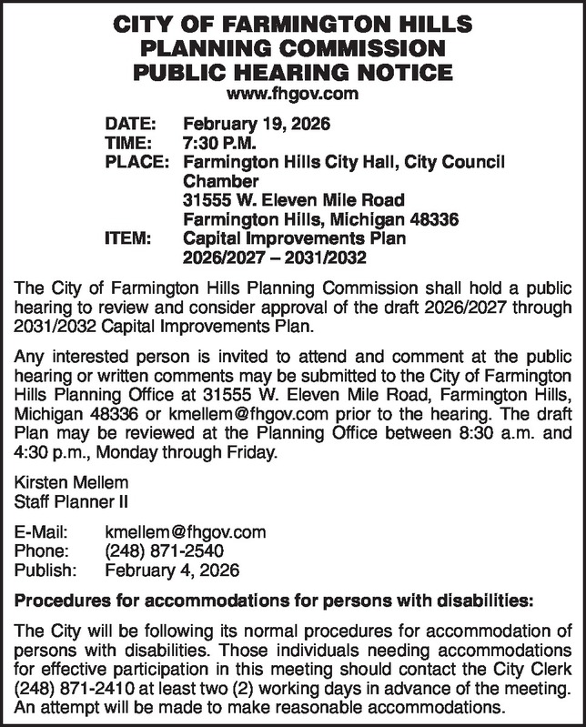 CITY OF FARMINGTON HILLS PLANNING COMMISSION PUBLIC HEARING NOTICE www.fhgov.com DATE: February 19, 2026 TIME: 7:30 P.M. PLACE: Farmington Hills City Hall, City Council Chamber 31555 W. Eleven Mile Road Farmington Hills, Michigan 48336 ITEM: Capital Improvements Plan 2026/2027 – 2031/2032 The City of Farmington Hills Planning Commission shall hold a public hearing to review and consider approval of the draft 2026/2027 through 2031/2032 Capital Improvements Plan. Any interested person is invited to attend and comment at the public hearing or written comments may be submitted to the City of Farmington Hills Planning Office at 31555 W. Eleven Mile Road, Farmington Hills, Michigan 48336 or kmellem@fhgov.com prior to the hearing. The draft Plan may be reviewed at the Planning Office between 8:30 a.m. and 4:30 p.m., Monday through Friday. Kirsten Mellem Staff Planner II E-Mail: kmellem@fhgov.com Phone: (248) 871-2540 Publish: February 4, 2026 Procedures for accommodations for persons with disabilities: The City will be following its normal procedures for accommodation of persons with disabilities. Those individuals needing accommodations for effective participation in this meeting should contact the City Clerk (248) 871-2410 at least two (2) working days in advance of the meeting. An attempt will be made to make reasonable accommodations.