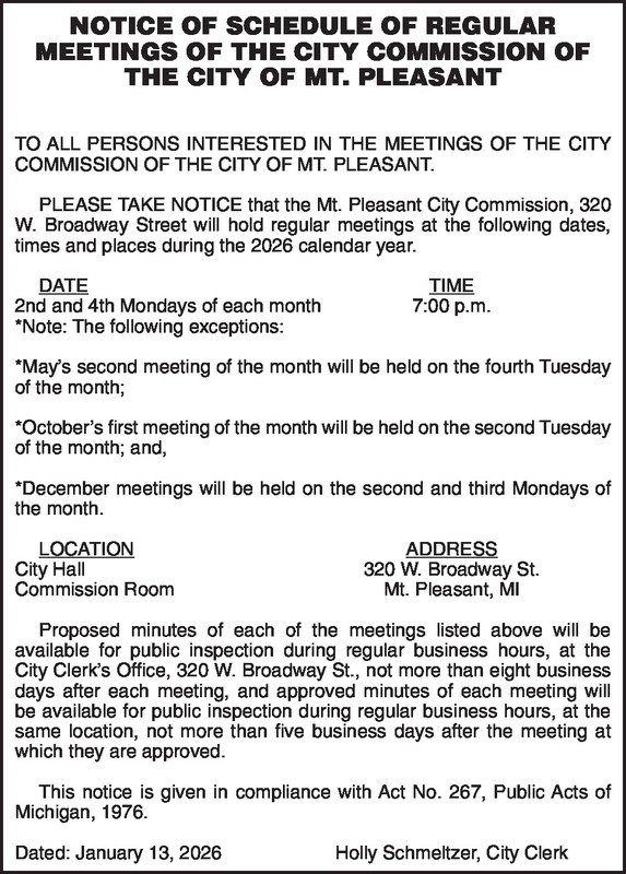 NOTICE OF SCHEDULE OF REGULAR MEETINGS OF THE CITY COMMISSION OF THE CITY OF MT. PLEASANT TO ALL PERSONS INTERESTED IN THE MEETINGS OF THE CITY COMMISSION OF THE CITY OF MT. PLEASANT. PLEASE TAKE NOTICE that the Mt. Pleasant City Commission, 320 W. Broadway Street will hold regular meetings at the following dates, times and places during the 2026 calendar year. DATE TIME 2nd and 4th Mondays of each month 7:00 p.m. *Note: The following exceptions: *May’s second meeting of the month will be held on the fourth Tuesday of the month; *October’s first meeting of the month will be held on the second Tuesday of the month; and, *December meetings will be held on the second and third Mondays of the month. LOCATION ADDRESS City Hall 320 W. Broadway St. Commission Room Mt. Pleasant, MI Proposed minutes of each of the meetings listed above will be available for public inspection during regular business hours, at the City Clerk's Office, 320 W. Broadway St., not more than eight business days after each meeting, and approved minutes of each meeting will be available for public inspection during regular business hours, at the same location, not more than five business days after the meeting at which they are approved. This notice is given in compliance with Act No. 267, Public Acts of Michigan, 1976. Dated: January 13, 2026 Holly