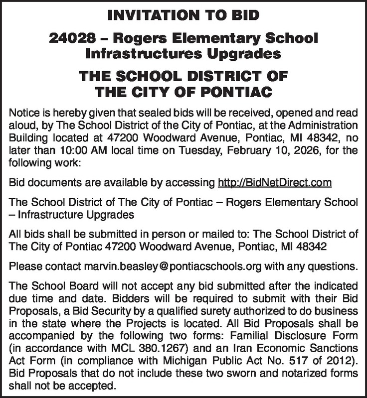 INVITATION TO BID 24028 – Rogers Elementary School Infrastructures Upgrades THE SCHOOL DISTRICT OF THE CITY OF PONTIAC Notice is hereby given that sealed bids will be received, opened and read aloud, by The School District of the City of Pontiac, at the Administration Building located at 47200 Woodward Avenue, Pontiac, MI 48342, no later than 10:00 AM local time on Tuesday, February 10, 2026, for the following work: Bid documents are available by accessing http://BidNetDirect.com The School District of The City of Pontiac – Rogers Elementary School – Infrastructure Upgrades All bids shall be submitted in person or mailed to: The School District of The City of Pontiac 47200 Woodward Avenue, Pontiac, MI 48342 Please contact marvin.beasley@pontiacschools.org with any questions. The School Board will not accept any bid submitted after the indicated due time and date. Bidders will be required to submit with their Bid Proposals, a Bid Security by a qualified surety authorized to do business in the state where the Projects is located. All Bid Proposals shall be accompanied by the following two forms: Familial Disclosure Form (in accordance with MCL 380.1267) and an Iran Economic Sanctions Act Form (in compliance with Michigan Public Act No. 517 of 2012). Bid Proposals that do not include these two sworn and notarized forms shall not be accepted.