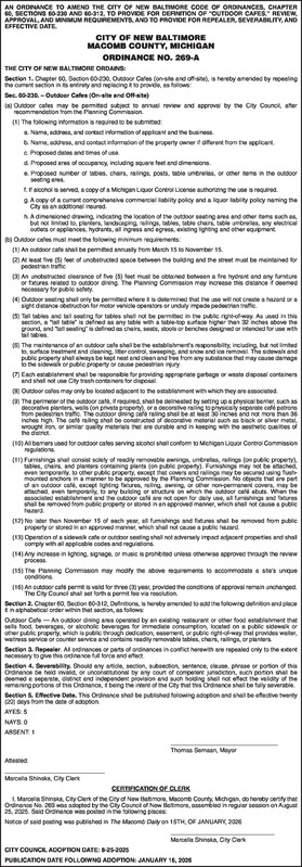 MOTION MADE BY: DUFFY MOTION SECONDED BY: DITTRICH AN ORDINANCE TO AMEND THE CITY OF NEW BALTIMORE CODE OF ORDINANCES, CHAPTER 60, SECTIONS 60-230 AND 60-312, TO PROVIDE FOR DEFINITION OF “OUTDOOR CAFES,” REVIEW, APPROVAL, AND MINIMUM REQUIREMENTS, AND TO PROVIDE FOR REPEALER, SEVERABILITY, AND EFFECTIVE DATE. CITY OF NEW BALTIMORE MACOMB COUNTY, MICHIGAN ORDINANCE NO. 269-A THE CITY OF NEW BALTIMORE ORDAINS: Section 1. Chapter 60, Section 60-230, Outdoor Cafes (on-site and off-site), is hereby amended by repealing the current section in its entirety and replacing it to provide, as follows: Sec. 60-230. – Outdoor Cafes (On-site and Off-site) (a) Outdoor cafes may be permitted subject to annual review and approval by the City Council, after recommendation from the Planning Commission. (1) The following information is required to be submitted: a. Name, address, and contact information of applicant and the business. b. Name, address, and contact information of the property owner if different from the applicant. c. Proposed dates and times of use. d. Proposed area of occupancy, including square feet and dimensions. e. Proposed number of tables, chairs, railings, posts, table umbrellas, or other items in the outdoor seating area. f. If alcohol is served, a copy of a Michigan Liquor Control License authorizing the use is required. g. A copy of a current comprehensive commercial liability policy and a liquor liability policy naming the City as an additional insured. h. A dimensioned drawing, indicating the location of the outdoor seating area and other items such as, but not limited to, planters, landscaping, railings, tables, table chairs, table umbrellas, any electrical outlets or appliances, hydrants, all ingress and egress, existing lighting and other equipment. (b) Outdoor cafes must meet the following minimum requirements: (1) An outdoor cafe shall be permitted annually from March 15 to November 15. (2) At least five (5) feet of unobstructed space between the building and the street must be maintained for pedestrian traffic (3) An unobstructed clearance of five (5) feet must be obtained between a fire hydrant and any furniture or fixtures related to outdoor dining. The Planning Commission may increase this distance if deemed necessary for public safety. (4) Outdoor seating shall only be permitted where it is determined that the use will not create a hazard or a sight distance obstruction for motor vehicle operators or unduly impede pedestrian traffic. (5) Tall tables and tall seating for tables shall not be permitted in the public right-of-way. As used in this section, a "tall table" is defined as any table with a table-top surface higher than 32 inches above the ground, and "tall seating" is defined as chairs, seats, stools or benches designed or intended for use with tall tables. (6) The maintenance of an outdoor cafe shall be the establishment's responsibility, including, but not limited to, surface treatment and cleaning, litter control, sweeping, and snow and ice removal. The sidewalk and public property shall always be kept neat and clean and free from any substance that may cause damage to the sidewalk or public property or cause pedestrian injury. (7) Each establishment shall be responsible for providing appropriate garbage or waste disposal containers and shall not use City trash containers for disposal. (8) Outdoor cafes may only be located adjacent to the establishment with which they are associated. (9) The perimeter of the outdoor café, if required, shall be delineated by setting up a physical barrier, such as decorative planters, walls (on private property), or a decorative railing to physically separate café patrons from pedestrian traffic. The outdoor dining café railing shall be at least 30 inches and not more than 36 inches high. The café railing shall be constructed of decorative material such as black or silver metal, wrought iron, or similar quality materials that are durable and in keeping with the aesthetic qualities of the district. (10) All barriers used for outdoor cafes serving alcohol shall conform to Michigan Liquor Control Commission regulations. (11) Furnishings shall consist solely of readily removable awnings, umbrellas, railings (on public property), tables, chairs, and planters containing plants (on public property). Furnishings may not be attached, even temporarily, to other public property, except that covers and railings may be secured using flush-mounted anchors in a manner to be approved by the Planning Commission. No objects that are part of an outdoor café, except lighting fixtures, railing, awning, or other non-permanent covers, may be attached, even temporarily, to any building or structure on which the outdoor café abuts. When the associated establishment and the outdoor café are not open for daily use, all furnishings and fixtures shall be removed from public property or stored in an approved manner, which shall not cause a public hazard. (12) No later than November 15 of each year, all furnishings and fixtures shall be removed from public property or stored in an approved manner, which shall not cause a public hazard. (13) Operation of a sidewalk cafe or outdoor seating shall not adversely impact adjacent properties and shall comply with all applicable codes and regulations. (14) Any increase in lighting, signage, or music is prohibited unless otherwise approved through the review process. (15) The Planning Commission may modify the above requirements to accommodate a site's unique conditions. (16) An outdoor café permit is valid for three (3) year, provided the conditions of approval remain unchanged. The City Council shall set forth a permit fee via resolution. Section 2. Chapter 60, Section 60-312, Definitions, is hereby amended to add the following definition and place it in alphabetical order within that section, as follows: Outdoor Cafe — An outdoor dining area operated by an existing restaurant or other food establishme