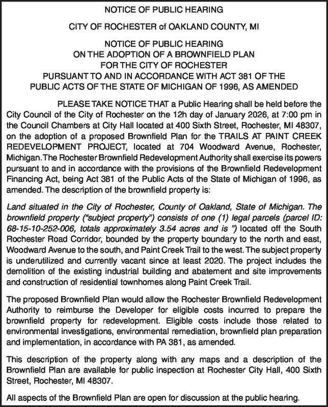 NOTICE OF PUBLIC HEARING CITY OF ROCHESTER of OAKLAND COUNTY, MI NOTICE OF PUBLIC HEARING ON THE ADOPTION OF A BROWNFIELD PLAN FOR THE CITY OF ROCHESTER PURSUANT TO AND IN ACCORDANCE WITH ACT 381 OF THE PUBLIC ACTS OF THE STATE OF MICHIGAN OF 1996, AS AMENDED PLEASE TAKE NOTICE THAT a Public Hearing shall be held before the City Council of the City of Rochester on the 12h day of January 2026, at 7:00 pm in the Council Chambers at City Hall located at 400 Sixth Street, Rochester, MI 48307, on the adoption of a proposed Brownfield Plan for the TRAILS AT PAINT CREEK REDEVELOPMENT PROJECT, located at 704 Woodward Avenue, Rochester, Michigan. The Rochester Brownfield Redevelopment Authority shall exercise its powers pursuant to and in accordance with the provisions of the Brownfield Redevelopment Financing Act, being Act 381 of the Public Acts of the State of Michigan of 1996, as amended. The description of the brownfield property is: Land situated in the City of Rochester, County of Oakland, State of Michigan. The brownfield property (“subject property”) consists of one (1) legal parcels (parcel ID: 68-15-10-252-006, totals approximately 3.54 acres and is ”) located off the South Rochester Road Corridor, bounded by the property boundary to the north and east, Woodward Avenue to the south, and Paint Creek Trail to the west. The subject property is underutilized and currently vacant since at least 2020. The project includes the demolition of the existing industrial building and abatement and site improvements and construction of residential townhomes along Paint Creek Trail. The proposed Brownfield Plan would allow the Rochester Brownfield Redevelopment Authority to reimburse the Developer for eligible costs incurred to prepare the brownfield property for redevelopment. Eligible costs include those related to environmental investigations, environmental remediation, brownfield plan preparation and implementation, in accordance with PA 381, as amended. This description of the property along with any maps and a description of the Brownfield Plan are available for public inspection at Rochester City Hall, 400 Sixth Street, Rochester, MI 48307. All aspects of the Brownfield Plan are open for discussion