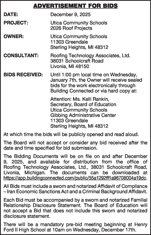 ADVERTISEMENT FOR BIDS DATE: December 9, 2025 PROJECT: Utica Community Schools 2026 Roof Projects OWNER: Utica Community Schools 11303 Greendale Sterling Heights, MI 48312 CONSULTANT: Roofing Technology Associates, Ltd. 38031 Schoolcraft Road Livonia, MI 48150 BIDS RECEIVED: Until 1:00 pm local time on Wednesday, January 7th, the Owner will receive sealed bids for the work electronically through Building Connected or via hard copy at: Attention: Ms. Kelli Rankin, Secretary, Board of Education Utica Community Schools Gibbing Administrative Center 11303 Greendale Sterling Heights, MI 48312 At which time the bids will be publicly opened and read aloud. The Board will not accept or consider any bid received after the date and time specified for bid submission. The Bidding Documents will be on file on and after December 9, 2025, and available for distribution from the office of Roofing Technology Associates, Ltd., 38031 Schoolcraft Road, Livonia, Michigan. The documents can be downloaded at https://app.buildingconnected.com/public/55a1292ff1a96708004a19dc . All Bids must include a sworn and notarized Affidavit of Compliance – Iran Economic Sanctions Act and a Criminal Background Affidavit. Each Bid must be accompanied by a sworn and notarized Familial Relationship Disclosure Statement. The Board of Education will not accept a Bid that does not include this sworn and notarized disclosure statement. There will be a mandatory pre-bid meeting beginning at Henry Ford II High School at 10am on Wednesday, December 17th.