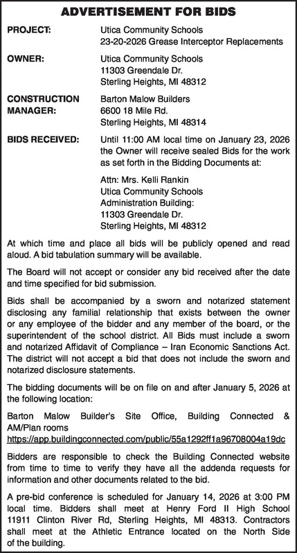 ADVERTISEMENT FOR BIDS PROJECT: Utica Community Schools 23-20-2026 Grease Interceptor Replacements OWNER: Utica Community Schools 11303 Greendale Dr. Sterling Heights, MI 48312 CONSTRUCTION Barton Malow Builders MANAGER: 6600 18 Mile Rd. Sterling Heights, MI 48314 BIDS RECEIVED: Until 11:00 AM local time on January 23, 2026 the Owner will receive sealed Bids for the work as set forth in the Bidding Documents at: Attn: Mrs. Kelli Rankin Utica Community Schools Administration Building: 11303 Greendale Dr. Sterling Heights, MI 48312 At which time and place all bids will be publicly opened and read aloud. A bid tabulation summary will be available. The Board will not accept or consider any bid received after the date and time specified for bid submission. Bids shall be accompanied by a sworn and notarized statement disclosing any familial relationship that exists between the owner or any employee of the bidder and any member of the board, or the superintendent of the school district. All Bids must include a sworn and notarized Affidavit of Compliance – Iran Economic Sanctions Act. The district will not accept a bid that does not include the sworn and notarized disclosure statements. The bidding documents will be on file on and after January 5, 2026 at the following location: Barton Malow Builder’s Site Office, Building Connected & AM/Plan rooms https://app.buildingconnected.com/public/55a1292ff1a96708004a19dc Bidders are responsible to check the Building Connected website from time to time to verify they have all the addenda requests for information and other documents related to the bid. A pre-bid conference is scheduled for January 14, 2026 at 3:00 PM local time. Bidders shall meet at Henry Ford II High School 11911 Clinton River Rd, Sterling Heights, MI 48313. Contractors shall meet at the Athletic Entrance located on the North Side of the building.