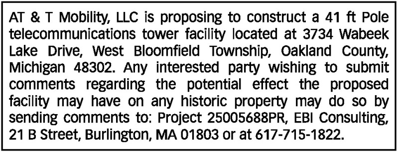 AT & T Mobility, LLC is proposing to construct a 41 ft Pole telecommunications tower facility located at 3734 Wabeek Lake Drive, West Bloomfield Township, Oakland County, Michigan 48302. Any interested party wishing to submit comments regarding the potential effect the proposed facility may have on any historic property may do so by sending comments to: Project 25005688PR, EBI Consulting, 21 B Street, Burlington, MA 01803 or at 617-715-1822.