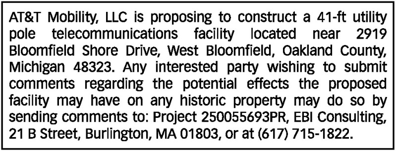 AT&T Mobility, LLC is proposing to construct a 41-ft utility pole telecommunications facility located near 2919 Bloomfield Shore Drive, West Bloomfield, Oakland County, Michigan 48323. Any interested party wishing to submit comments regarding the potential effects the proposed facility may have on any historic property may do so by sending comments to: Project 250055693PR, EBI Consulting, 21 B Street, Burlington, MA 01803, or at (617) 715-1822.