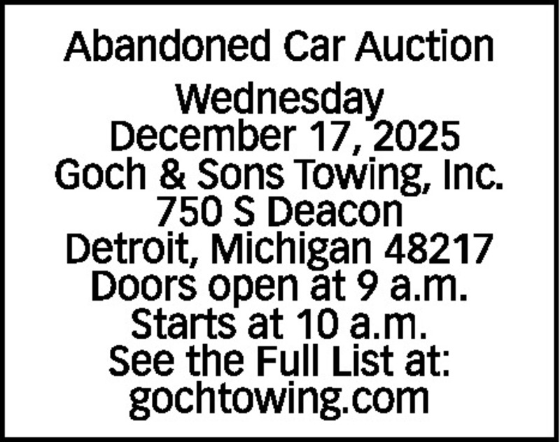 Abandoned Car Auction Wednesday December 17, 2025 Goch & Sons Towing, Inc. 750 S Deacon Detroit, Michigan 48217 Doors open at 9 a.m. Starts at 10 a.m. See the Full List at: gochtowing.com