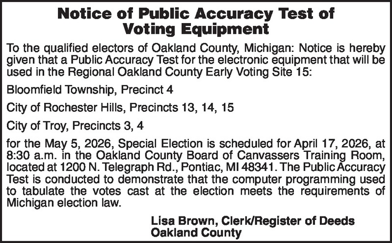 Notice of Public Accuracy Test of Voting Equipment To the qualified electors of Oakland County, Michigan: Notice is hereby given that a Public Accuracy Test for the electronic equipment that will be used in the Regional Oakland County Early Voting Site 15: Bloomfield Township, Precinct 4 City of Rochester Hills, Precincts 13, 14, 15 City of Troy, Precincts 3, 4 for the May 5, 2026, Special Election is scheduled for April 17, 2026, at 8:30 a.m. in the Oakland County Board of Canvassers Training Room, located at 1200 N. Telegraph Rd., Pontiac, MI 48341. The Public Accuracy Test is conducted to demonstrate that the computer programming used to tabulate the votes cast at the election meets the requirements of Michigan election law. Lisa Brown, Clerk/Register of Deeds Oakland County