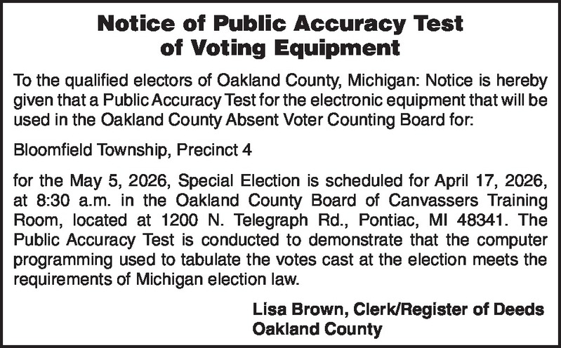 Notice of Public Accuracy Test of Voting Equipment To the qualified electors of Oakland County, Michigan: Notice is hereby given that a Public Accuracy Test for the electronic equipment that will be used in the Oakland County Absent Voter Counting Board for: Bloomfield Township, Precinct 4 for the May 5, 2026, Special Election is scheduled for April 17, 2026, at 8:30 a.m. in the Oakland County Board of Canvassers Training Room, located at 1200 N. Telegraph Rd., Pontiac, MI 48341. The Public Accuracy Test is conducted to demonstrate that the computer programming used to tabulate the votes cast at the election meets the requirements of Michigan election law. Lisa Brown, Clerk/Register of Deeds Oakland County