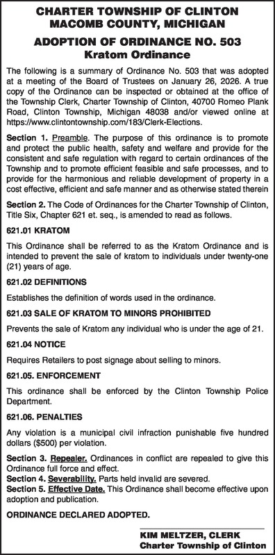 CHARTER TOWNSHIP OF CLINTON MACOMB COUNTY, MICHIGAN ADOPTION OF ORDINANCE NO. 503 Kratom Ordinance The following is a summary of Ordinance No. 503 that was adopted at a meeting of the Board of Trustees on January 26, 2026. A true copy of the Ordinance can be inspected or obtained at the office of the Township Clerk, Charter Township of Clinton, 40700 Romeo Plank Road, Clinton Township, Michigan 48038 and/or viewed online at https://www.clintontownship.com/183/Clerk-Elections. Section 1. Preamble. The purpose of this ordinance is to promote and protect the public health, safety and welfare and provide for the consistent and safe regulation with regard to certain ordinances of the Township and to promote efficient feasible and safe processes, and to provide for the harmonious and reliable development of property in a cost effective, efficient and safe manner and as otherwise stated therein Section 2. The Code of Ordinances for the Charter Township of Clinton, Title Six, Chapter 621 et. seq., is amended to read as follows. 621.01 KRATOM This Ordinance shall be referred to as the Kratom Ordinance and is intended to prevent the sale of kratom to individuals under twenty-one (21) years of age. 621.02 DEFINITIONS Establishes the definition of words used in the ordinance. 621.03 SALE OF KRATOM TO MINORS PROHIBITED Prevents the sale of Kratom any individual who is under the age of 21. 621.04 NOTICE Requires Retailers to post signage about selling to minors. 621.05. ENFORCEMENT This ordinance shall be enforced by the Clinton Township Police Department. 621.06. PENALTIES Any violation is a municipal civil infraction punishable five hundred dollars ($500) per violation. Section 3. Repealer. Ordinances in conflict are repealed to give this Ordinance full force and effect. Section 4. Severability. Parts held invalid are severed. Section 5. Effective Date. This Ordinance shall become effective upon adoption and publication. ORDINANCE DECLARED ADOPTED. _________________________________ KIM MELTZER, CLERK Charter Township of Clinton