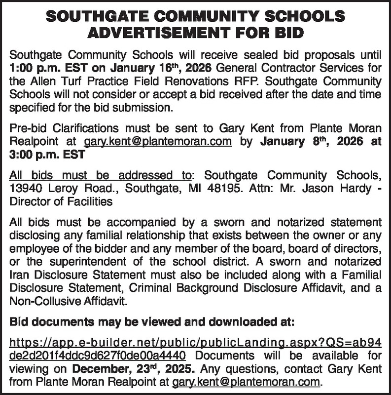 Southgate Community Schools Advertisement for Bid Southgate Community Schools will receive sealed bid proposals until 1:00 p.m. EST on January 16th, 2026 General Contractor Services for the Allen Turf Practice Field Renovations RFP. Southgate Community Schools will not consider or accept a bid received after the date and time specified for the bid submission. Pre-bid Clarifications must be sent to Gary Kent from Plante Moran Realpoint at gary.kent@plantemoran.com by January 8th, 2026 at 3:00 p.m. EST All bids must be addressed to: Southgate Community Schools, 13940 Leroy Road., Southgate, MI 48195. Attn: Mr. Jason Hardy - Director of Facilities All bids must be accompanied by a sworn and notarized statement disclosing any familial relationship that exists between the owner or any employee of the bidder and any member of the board, board of directors, or the superintendent of the school district. A sworn and notarized Iran Disclosure Statement must also be included along with a Familial Disclosure Statement, Criminal Background Disclosure Affidavit, and a Non-Collusive Affidavit. Bid documents may be viewed and downloaded at: https://app.e-builder.net/public/publicLanding.aspx?QS=ab94de2d201f4ddc9d627f0de00a4440 Documents will be available for viewing on December, 23rd, 2025. Any questions, contact Gary Kent from Plante Moran Realpoint at gary.kent@plantemoran.com.