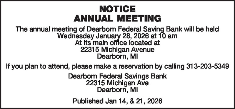 NOTICE Annual Meeting The annual meeting of Dearborn Federal Saving Bank will be held Wednesday January 28, 2026 at 10 am At its main office located at 22315 Michigan Avenue Dearborn, MI If you plan to attend, please make a reservation by calling 313-203-5349 Dearborn Federal Savings Bank 22315 Michigan Ave Dearborn, MI Published Jan 14, & 21, 2026