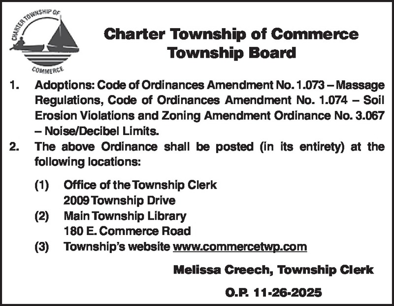 Charter Township of Commerce Township Board 1. Adoptions: Code of Ordinances Amendment No. 1.073 – Massage Regulations, Code of Ordinances Amendment No. 1.074 – Soil Erosion Violations and Zoning Amendment Ordinance No. 3.067 – Noise/Decibel Limits. 2. The above Ordinance shall be posted (in its entirety) at the following locations: (1) Office of the Township Clerk 2009 Township Drive (2) Main Township Library 180 E. Commerce Road (3) Township’s website www.commercetwp.com Melissa Creech, Township Clerk O.P. 11-26-2025