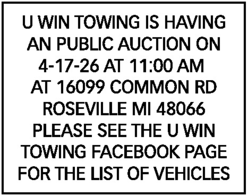 U WIN TOWING IS HAVING AN PUBLIC AUCTION ON 4-17-26 AT 11:00 AM AT 16099 COMMON RD ROSEVILLE MI 48066 PLEASE SEE THE U WIN TOWING FACEBOOK PAGE FOR THE LIST OF VEHICLES