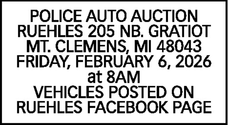 POLICE AUTO AUCTION RUEHLES 205 NB. GRATIOT MT. CLEMENS, MI 48043 FRIDAY, FEBRUARY 6, 2026 at 8AM VEHICLES POSTED ON RUEHLES FACEBOOK PAGE