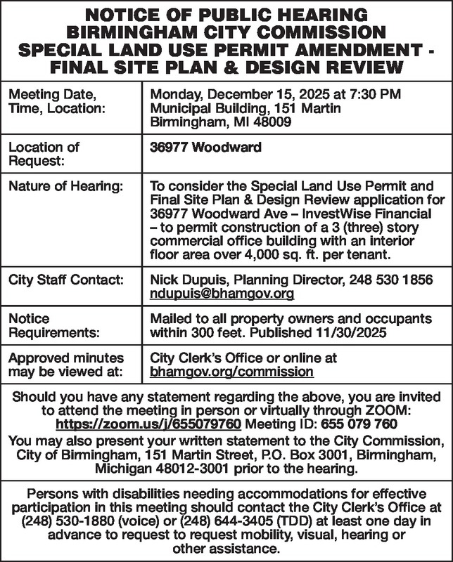 NOTICE OF PUBLIC HEARING BIRMINGHAM CITY COMMISSION SPECIAL LAND USE PERMIT AMENDMENT - FINAL SITE PLAN & DESIGN REVIEW Monday, December 15, 2025 at 7:30 PM Municipal Building, 151 Martin Birmingham, MI 48009 Location of Request: 36977 Woodward Nature of Hearing: To consider the Special Land Use Permit and Final Site Plan & Design Review application for 36977 Woodward Ave – InvestWise Financial – to permit construction of a 3 (three) story commercial office building with an interior floor area over 4,000 sq. ft. per tenant. City Staff Contact: Nick Dupuis, Planning Director, 248 530 1856 ndupuis@bhamgov.org Notice Requirements: Mailed to all property owners and occupants within 300 feet. Published 11/30/2025 Approved minutes may be viewed at: City Clerk’s Office or online at bhamgov.org/commission Should you have any statement regarding the above, you are invited to attend the meeting in person or virtually through ZOOM: https://zoom.us/j/655079760 Meeting ID: 655 079 760 You may also present your written statement to the City Commission, City of Birmingham, 151 Martin Street, P.O. Box 3001, Birmingham, Michigan 48012-3001 prior to the hearing. Persons with disabilities needing accommodations for effective participation in this meeting should contact the City Clerk's Office at (248) 530-1880 (voice) or (248) 644-3405 (TDD) at least one day in advance to request to request