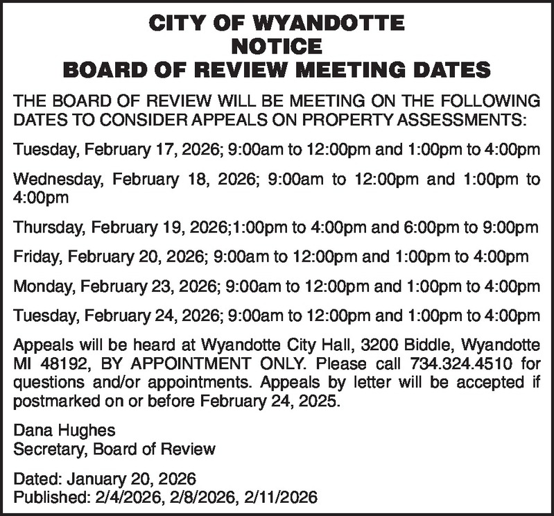 CITY OF WYANDOTTE NOTICE BOARD OF REVIEW MEETING DATES THE BOARD OF REVIEW WILL BE MEETING ON THE FOLLOWING DATES TO CONSIDER APPEALS ON PROPERTY ASSESSMENTS: Tuesday, February 17, 2026; 9:00am to 12:00pm and 1:00pm to 4:00pm Wednesday, February 18, 2026; 9:00am to 12:00pm and 1:00pm to 4:00pm Thursday, February 19, 2026;1:00pm to 4:00pm and 6:00pm to 9:00pm Friday, February 20, 2026; 9:00am to 12:00pm and 1:00pm to 4:00pm Monday, February 23, 2026; 9:00am to 12:00pm and 1:00pm to 4:00pm Tuesday, February 24, 2026; 9:00am to 12:00pm and 1:00pm to 4:00pm Appeals will be heard at Wyandotte City Hall, 3200 Biddle, Wyandotte MI 48192, BY APPOINTMENT ONLY. Please call 734.324.4510 for questions and/or appointments. Appeals by letter will be accepted if postmarked on or before February 24, 2025. Dana Hughes Secretary, Board of Review Dated: January 20, 2026 Published: 2/4/2026, 2/8/2026, 2/11/2026