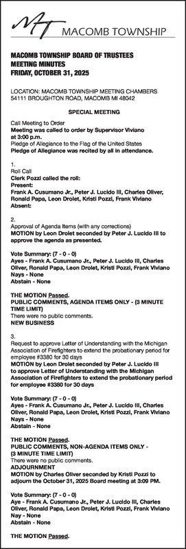MACOMB TOWNSHIP BOARD OF TRUSTEES MEETING MINUTES FRIDAY, OCTOBER 31, 2025 LOCATION: MACOMB TOWNSHIP MEETING CHAMBERS 54111 BROUGHTON ROAD, MACOMB MI 48042 SPECIAL MEETING Call Meeting to Order Meeting was called to order by Supervisor Viviano at 3:00 p.m. Pledge of Allegiance to the Flag of the United States Pledge of Allegiance was recited by all in attendance. 1. Roll Call Clerk Pozzi called the roll: Present: Frank A. Cusumano Jr., Peter J. Lucido III, Charles Oliver, Ronald Papa, Leon Drolet, Kristi Pozzi, Frank Viviano Absent: 2. Approval of Agenda Items (with any corrections) MOTION by Leon Drolet seconded by Peter J. Lucido III to approve the agenda as presented. Vote Summary: (7 - 0 - 0) Ayes - Frank A. Cusumano Jr., Peter J. Lucido III, Charles Oliver, Ronald Papa, Leon Drolet, Kristi Pozzi, Frank Viviano Nays - None Abstain - None THE MOTION Passed. PUBLIC COMMENTS, AGENDA ITEMS ONLY - (3 MINUTE TIME LIMIT) There were no public comments. NEW BUSINESS 3. Request to approve Letter of Understanding with the Michigan Association of Firefighters to extend the probationary period for employee #3380 for 30 days MOTION by Leon Drolet seconded by Peter J. Lucido III to approve Letter of Understanding with the Michigan Association of Firefighters to extend the probationary period for employee #3380 for 30 days Vote Summary: (7 - 0 - 0) Ayes - Frank A. Cusumano Jr., Peter J. Lucido III, Charles Oliver, Ronald Papa, Leon Drolet, Kristi Pozzi, Frank Viviano Nays - None Abstain - None THE MOTION Passed. PUBLIC COMMENTS, NON-AGENDA ITEMS ONLY - (3 MINUTE TIME LIMIT) There were no public comments. ADJOURNMENT MOTION by Charles Oliver seconded by Kristi Pozzi to adjourn the October 31, 2025 Board meeting at 3:09 PM. Vote Summary: (7 - 0 - 0) Aye - Frank A. Cusumano Jr., Peter J. Lucido III, Charles Oliver, Ronald Papa, Leon Drolet, Kristi Pozzi, Frank Viviano Nay - None Abstain - None THE MOTION Passed.